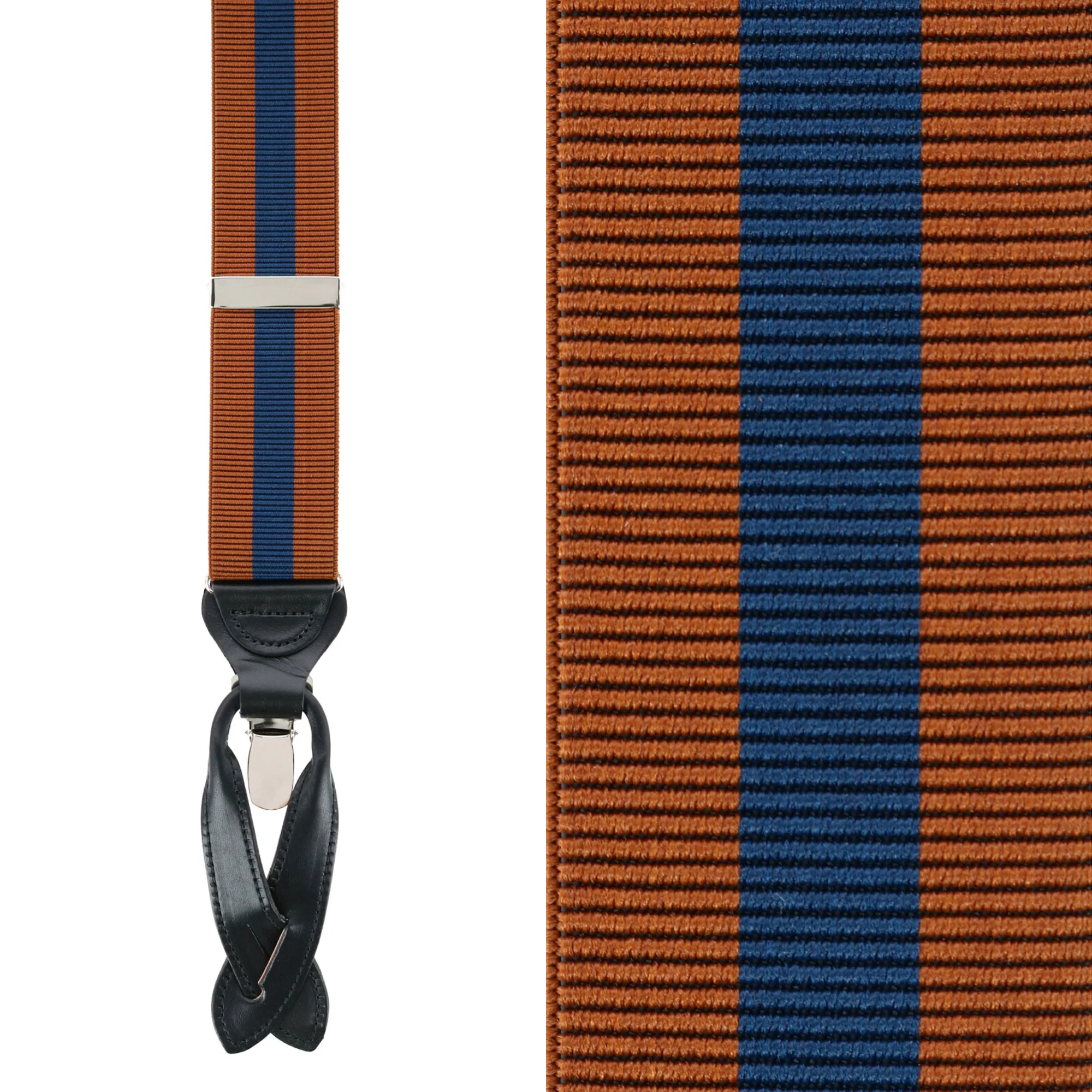 - Full grain leather back patch and button ends, silver adjusters and clip-ends